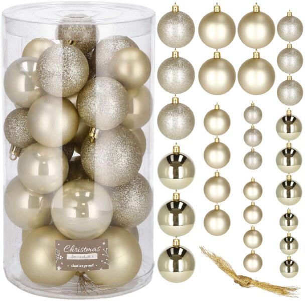30 db Arany Karácsonyfadísz Gömb: Ünnepi Csillogás a Fádon ✨ Elegáns és ünnepi hangulatot varázsolhatsz karácsonyfád díszítésével ezzel a 30 db arany karácsonyfadísz gömb készlettel! Különböző méretekben és felületekkel (matt, csillogó, fényes) érkeznek, hogy tökéletesen feldíszíthesd a fádat. A csomag tartalma: 30 db arany karácsonyfadísz gömb (kb. +/- 1 gömb) 6 cm-es gömbök: 3 db matt, 3 db csillogó, 3 db fényes 5 cm-es gömbök: 3 db matt, 4 db csillogó, 3 db fényes 4 cm-es gömbök: 3 db matt, 4 db csillogó, 3 db fényes Arany színű, törhetetlen akasztózsinór Anyag: Műanyag Méretek: 4, 5 és 6 cm Tökéletes választás: Elegáns arany szín Különböző felületek a változatos megjelenésért Törhetetlen anyag a biztonságos használatért Könnyű felakasztás az arany akasztózsinórral Idén is ragyogjon a karácsonyfád! ?