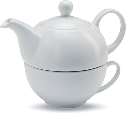 Teáskészlet: teáscsésze és egy 400 ml-es teáskancsó fehér kerámiából. Fekete ajándékdobozban.